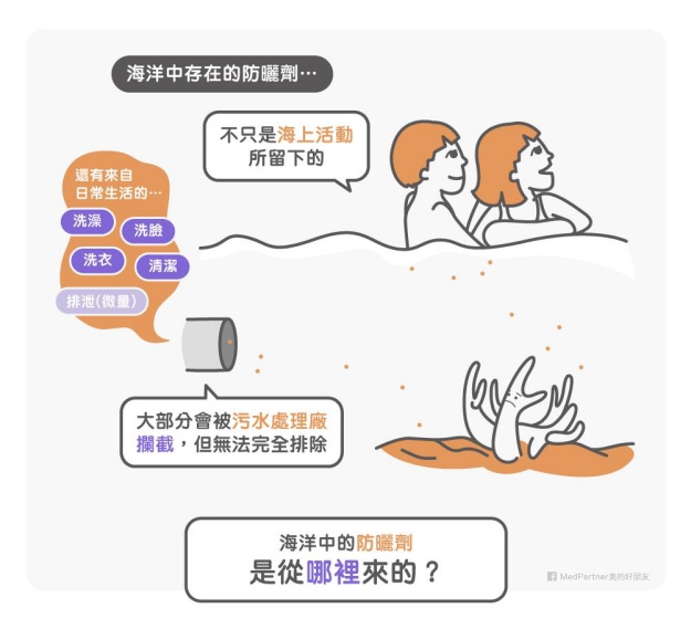 海洋存在的防曬劑不單只是因為海上活動所留下的,還有部分是來自於汙水處理廠所排出 (5) ,我們平常洗澡、洗臉、洗衣、清潔和排泄(部分會被人體微量吸收的防曬劑經皮吸收後排出)都可能有防曬劑 (6) 。汙水處理能攔截大部分防曬劑,但無法完全排除 (7) 。由於大部分的防曬成分都是脂溶性,能和脂肪組織相容,且易穿過細胞膜進入細胞,若是高穩定性的成分會更容易堆積在生物體內不易排出。因此目前有關化學性防曬劑的開發,都努力朝向讓分子更大,更不容易被皮膚吸收。這部分的差異,可以回去複習一下物理性防曬和化學性防曬的比較。