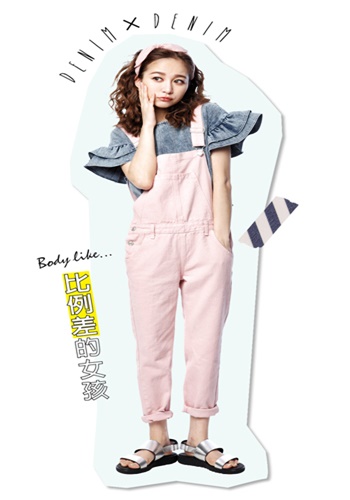 #比例差的女孩這時就要將吊帶調到比較短的位置,這樣可以縮短上半身的長度讓下半身看起來更修長,再加上可愛的荷葉袖上衣加重上半身的重量!