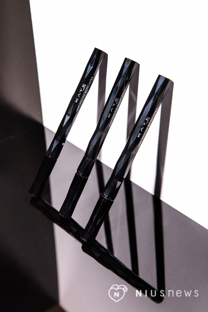 雖說眼影能替雙眼的魅力加不少分,若多加上一隻持久不易掉色的眼線筆,絕對是讓整體電力Power Up的秘密武器!這次很特別與文具專家pentel共同研發出進化版持久液體眼線筆EX 2.0,採用紡錘型筆尖軟硬適中、粗細線條都好畫好操控,勾勒想要的眼線風格。KATE這回特別著重眼線筆的筆尖設計,根據以往經驗,太軟的筆尖不好施力、畫不出俐落感的眼線;太硬的筆芯則是不好操控,很難畫出弧度曲線。想畫出「銳利帥氣」與「軟萌妹子」2種反差風格的眼線,一定要準備一隻彈性剛剛好的防水持久眼線筆!
