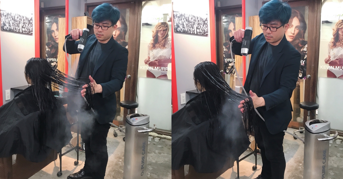 完成第三劑後,會使用水霧機加強頭髮的保濕,水霧機是將純水打成非常細的水分子,接觸在肌膚、頭髮上也不會濕搭搭,大約會噴灑10分鐘的時間,結束後再停留約五分鐘,才能進入最後一個護髮階段。