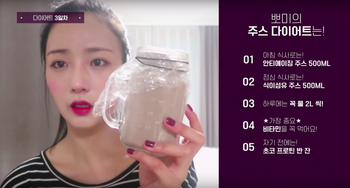 Apink的成員「普美」就在個人Youtube頻道「普普普」上公開他的「回歸前的瘦身秘技」,主要就是靠維他命C滿滿的「果汁減肥法」!他說:「在出道的7、8年內沒有沒嘗試過的減肥法!但是因為快速的瘦下來皮膚出現嚴重的過敏,真的十分辛苦…」所以表示這次介紹的果汁減肥法真的很適合自己(普美強調不是適合每一個人喔~不希望大家盲目跟著做喔!)健康又能補充維他命C,皮膚不再失控、過敏!甚至氣色還變好變亮了! (只是還是會很餓XD)