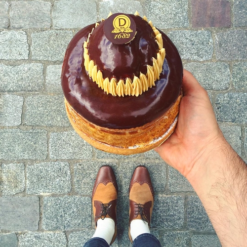 大家猜得出來這個甜點是用什麼做的嗎?其實是這是用八人份的泡芙酥皮所做出來的巧克力杏仁霜蛋糕,整個色調也是跟鞋子幾乎一模一樣!
