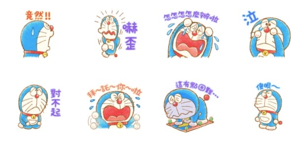 哆啦A夢款也是有收錄實用的日常問候語,不過手機小姐在這裡要特別介紹的是裡面的「哆啦A夢」崩潰系列,很適合用來表達負面情緒。尤其「怎怎怎怎麼辦啦」、「嚇歪」這兩張更傳神到不行,感到很緊張或很崩潰的時候,敬請讓哆啦A夢幫你傳達內心感受!