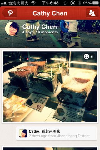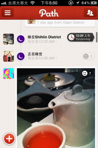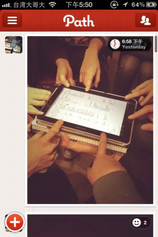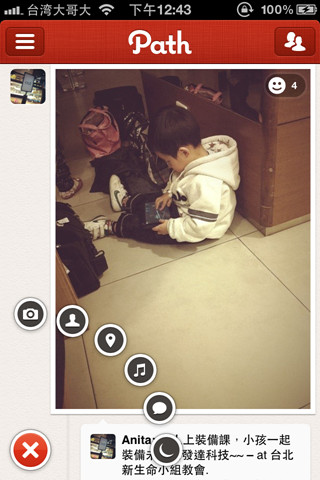 此外,當你在瀏覽Path主頁,上下捲動畫面時,會看見右上角有一個隨著活動發布時間而轉動的小時鐘,是Path的一個非常迷人小特點!