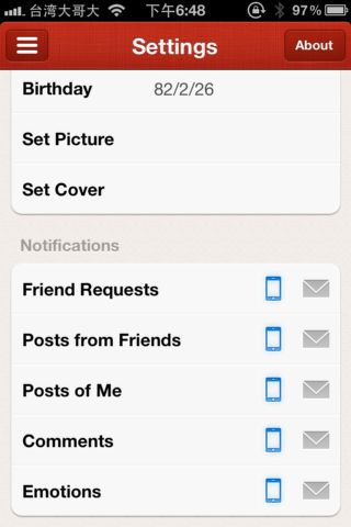 先來介紹與Facebook Timeline個人首頁有點類似的Path個人首頁。我們由Path主頁左上方的按鈕就能進入Settings頁面。在當中你可以設定你的Picture(小頭照)以及Cover(桌面背景);此外,在本頁面當中,你也可以設定當朋友拜訪你的Path,並留下不同回應時,Path用來通知你的方式(Email或是手機通知)。設定完後,你可以在設定選單中,進入自己的頁面中看見完整個人封面與目前使用Path的總時間。