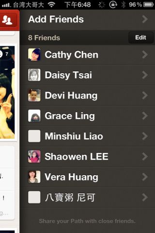 再來,我們可以在主頁的右上角點選人像的按鈕,進去尋找同樣在使用Path的好友(剛點入人像按鈕後,所看見的是目前的好友),或是邀請好友加入Path。
