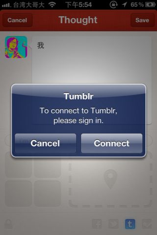 Path在打卡功能中,除了可以進行定位外之外,同樣也可以發言以及加入與你同在一起的朋友!不過雖然說Path是以親密社交網絡為設計理念,但你還是可以透過Path發布某一些打卡或是發言的訊息,只需要在發言的時候,輕點右下角的Facebook、Twitter、Tumblr、Foursquare的按鈕,就可以同時發布道你所點選的網站(若你先前沒有將Path與那些社群網站串聯起來,會需要在發言的同時,進行設定,並無法在設定的頁面當中先行設定)