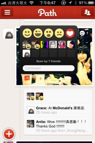 在Path裏頭,你可以針對朋友的每個照片、發言進行回應與表情符號的回應,也可以看見這個發言目前已被多少朋友(右上角灰色笑臉的右方數字)看見,是個在其他應用程式中較為少見的功能。