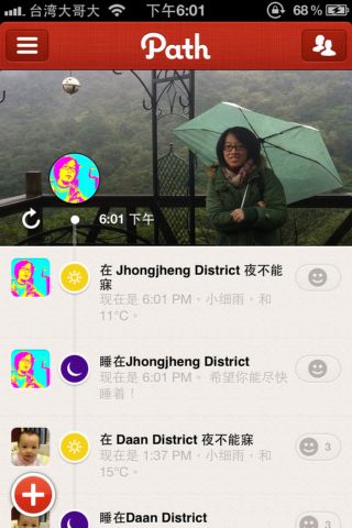 最後,再來介紹一個Path的貼心設計。就是還有分享睡眠時間的功能。當你點選左下角的「+」並按下月亮按鈕,Path就會問你是不是要發布你要去睡了的訊息,當你按下這樣的設定,Path會自動關閉Path當中好友新動態的通知,讓你安穩的睡一覺!此外,早晨起來按下Path當中的awake按鈕後,還會計算你的睡眠時間,告訴你目前外頭的天氣喔!