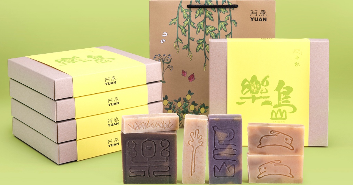 今年阿原品牌獨具巧思,設計可以「洗」可以「玩」的中秋禮盒,嚴選艾草、綠豆薏仁、檸檬、紫草洛神四款熱銷黃金手工皂,推出【樂島】中秋節禮盒,製皂原料來自天然青草,適用於全家男女老少、各種膚質,讓百草香伴左右,在忙碌的生活中,因為清潔,而能療瘉。有別於機器製皂,每一塊肥皂由製皂師以刨絲、捏揉、塑形等十八道工序而成,其中更將象形文字"搗藥"作拆解,如同疫情期間『Taiwan can help』,『搗』字即為在這座快樂的島嶼上懷抱著接納與開放去伸出手We help,『藥』以草木情深,勇敢面對樂於其中We do。我們皆是在一座快樂島嶼上共同尋求解藥的搗藥人。【搗藥】是人和萬物的創生關聯,【樂島】是我們對大地與環境的甚深承諾。