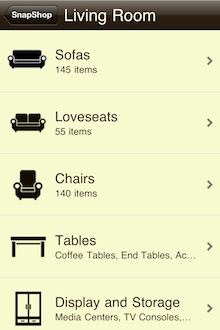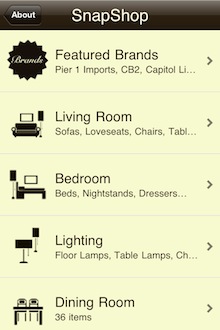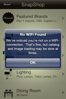 由於SnapShop需要下載大量的圖片資料,進入時會自動偵測有無WiFi連線,如果沒有WiFi會做提醒(SnapShop:圖片很多要等很久可千萬別怪我啊!)。進入程式後就來到種類分類,第一個是以精選品牌(Featured Brands)進入,下面則是空間及功能做區別,分別有:起居室(Living Room)、臥房(Bedroom)、照明(Lighting)、餐廳(Dining Room)、收納(Organize)、配件(Accessories)、孩童(Kids)及裝飾硬體(Decorative Hardware)等八種。