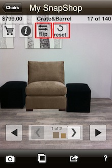 而雙箭頭的flip按鈕則是將家具鏡像旋轉,reset當然就是把所有設定還原啦。在下方則會把項目所有的顏色列出,可按左右箭頭切換,如果想看下一個家具也可以按大左右箭頭切換至下一件,或按上方Chairs箭頭回到上一頁的縮圖瀏覽!
