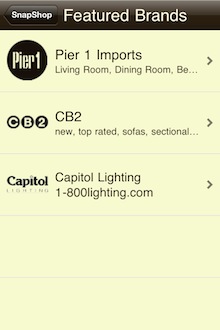 點選精選品牌進入,目前SnapShop在這個部份提供三個品牌的產品支援,分別是Pier 1 Imports、CB2、Capitol Lighting,這三個品牌都是美國的,但也都有提供國際運送的服務,所以如果真的很喜歡這些家具,是可以訂的到的(只是國際運費應該不便宜喔~)品牌點選進入後,就是該品牌各生活空間的種類啦。