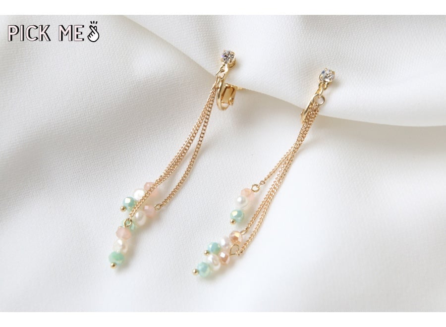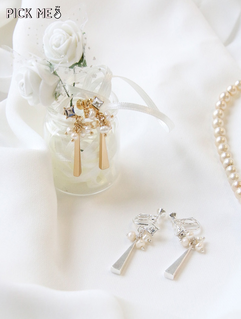 最後一款夾式水鑽珍珠串三角墜飾耳環一樣是氣質路線,珍珠配上水鑽很甜美,三角墜飾又多了點個性。