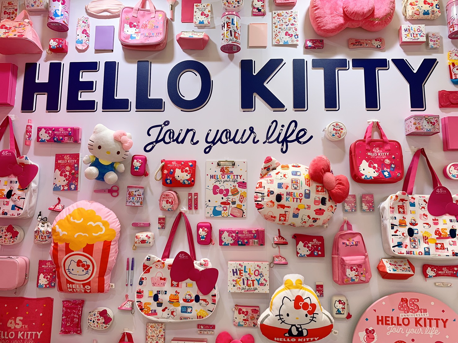 Hello Kitty 45周年專區上面佈滿了大大小小慶祝週年的限定商品,從抱枕、背包到小文具應盡有~45周年的設計圖案走一個繽紛活潑的路線,加上經典可愛的Kitty真的很想把商品通通帶回家♡