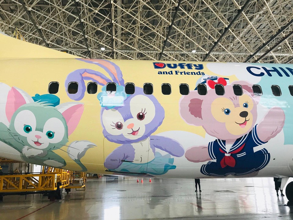 這架全新的「達菲·聯萌號」,首航於昆明到上海虹橋,之後也會由上海飛往濟南、信陽、深圳等航線,飛機彩繪外觀顏色繽紛夢幻、一次將達菲、雪莉梅、傑拉多尼、黛拉四大主人翁都搬上了。