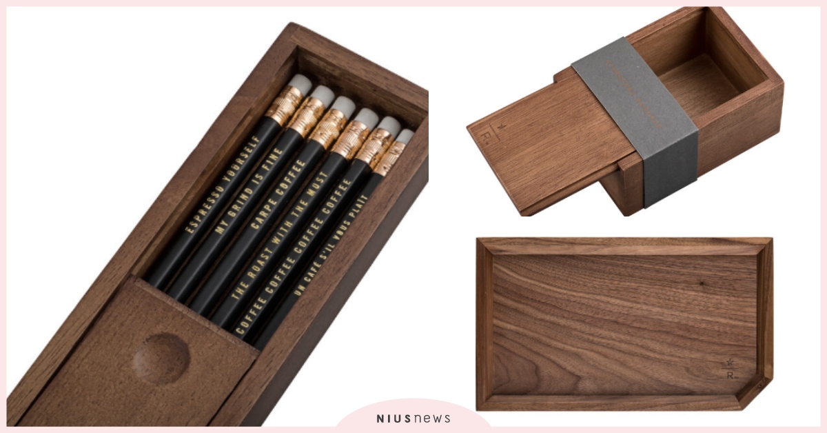 「wood box pencil set」,長方形的鉛筆盒身沒有太多華麗的裝飾,咖啡色的木質色顯得簡單又大方,就連黑色的鉛筆莫名都有種高級感,而且每支筆上方都有不同的字樣,像是「ESPRESSO YOURSELF」、「MY GRIND IS FINE」、「THE ROAST WITH THE MOST」等。