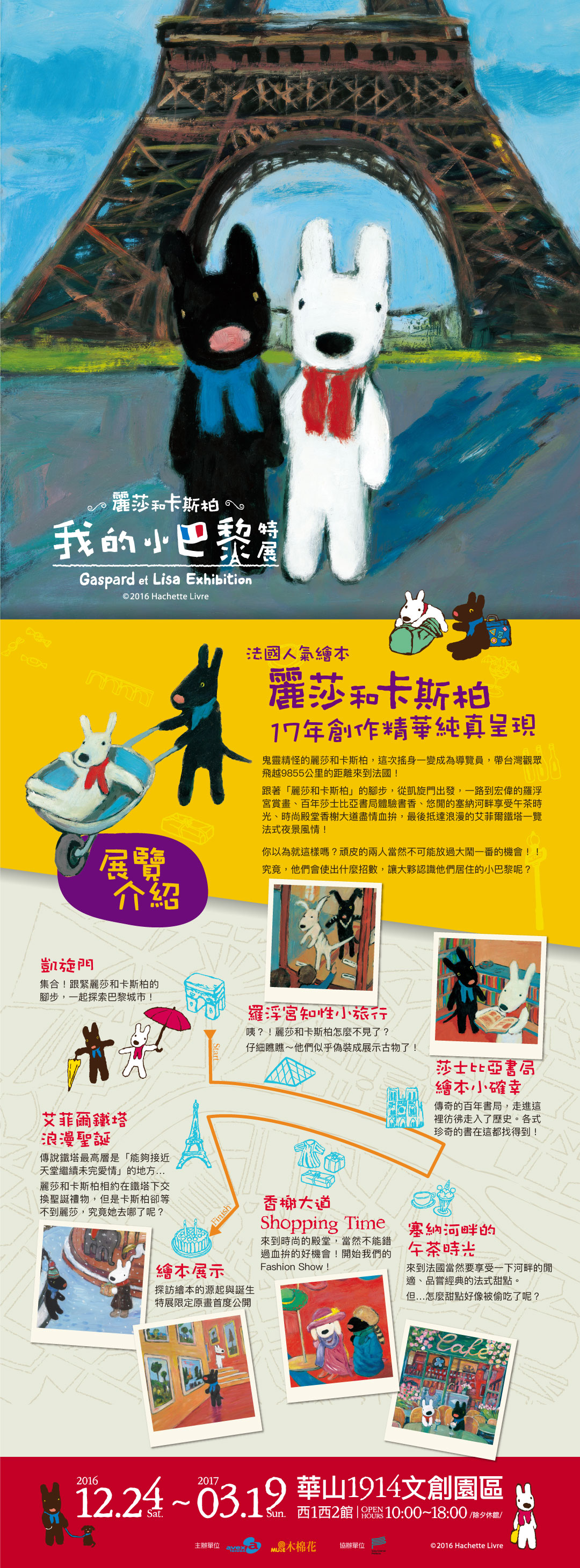 今年聖誕節,麗莎和卡斯柏遠從法國巴黎跨海來台!帶你遊盡凱旋門、浪漫艾菲爾鐵塔、悠閒塞納河畔下午茶及百年莎士比亞書店體驗書香,快跟上他們的腳步,一起探索這浪漫巴黎城市吧!前所未有的優雅之旅都在「麗莎和卡斯柏 我的小巴黎特展」。即日起至12月23日止,預售單人票獨家優惠199元(原價280元),加贈特展限定明信片1張,熱烈販售中!