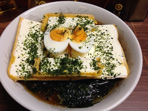 再來這碗看起來非常平凡的拉麵,就是傳說中的「咖啡牛奶」口味!據說吃起來其實沒有想像中那樣濃厚的咖啡味,但是隱含了淡淡的咖啡香和苦味,是個頗為新鮮的口味。