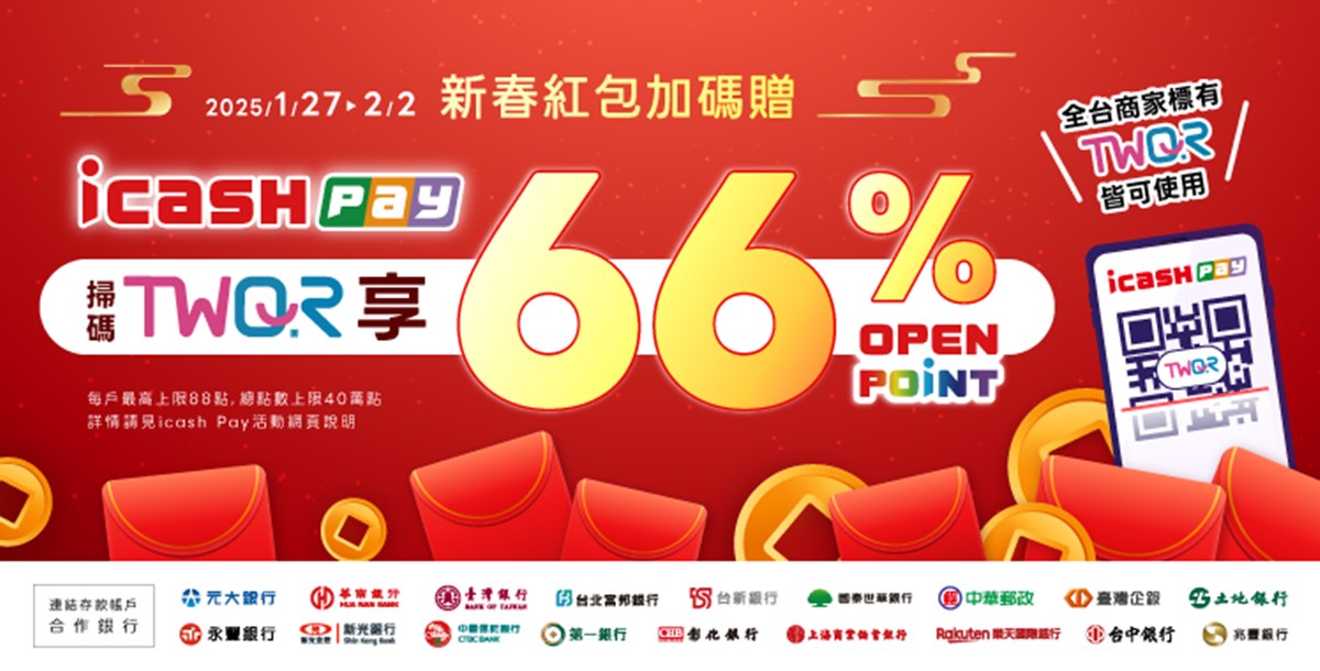 深受用戶喜愛的icash Pay掃碼TWQR回饋活動,春節期間升級大放送,加碼回饋66%,每戶上限調整至88點,讓用戶過年走春時,聰明消費賺回饋!自1月27日至2月2日,限時1週推出「TWQR掃碼迎財運,icash Pay新春紅包加碼66%」活動,活動期間民眾可以在全台標示TWQR店家使用icash Pay掃描QR Code付款,即享有66%OPENPOINT點數回饋,每戶最高回饋上限88點,活動總上限40萬點,此活動限定以【icash Pay帳戶進行付款】、【連結指定銀行帳戶付款】,TWQR使用icash Pay最好Pay。