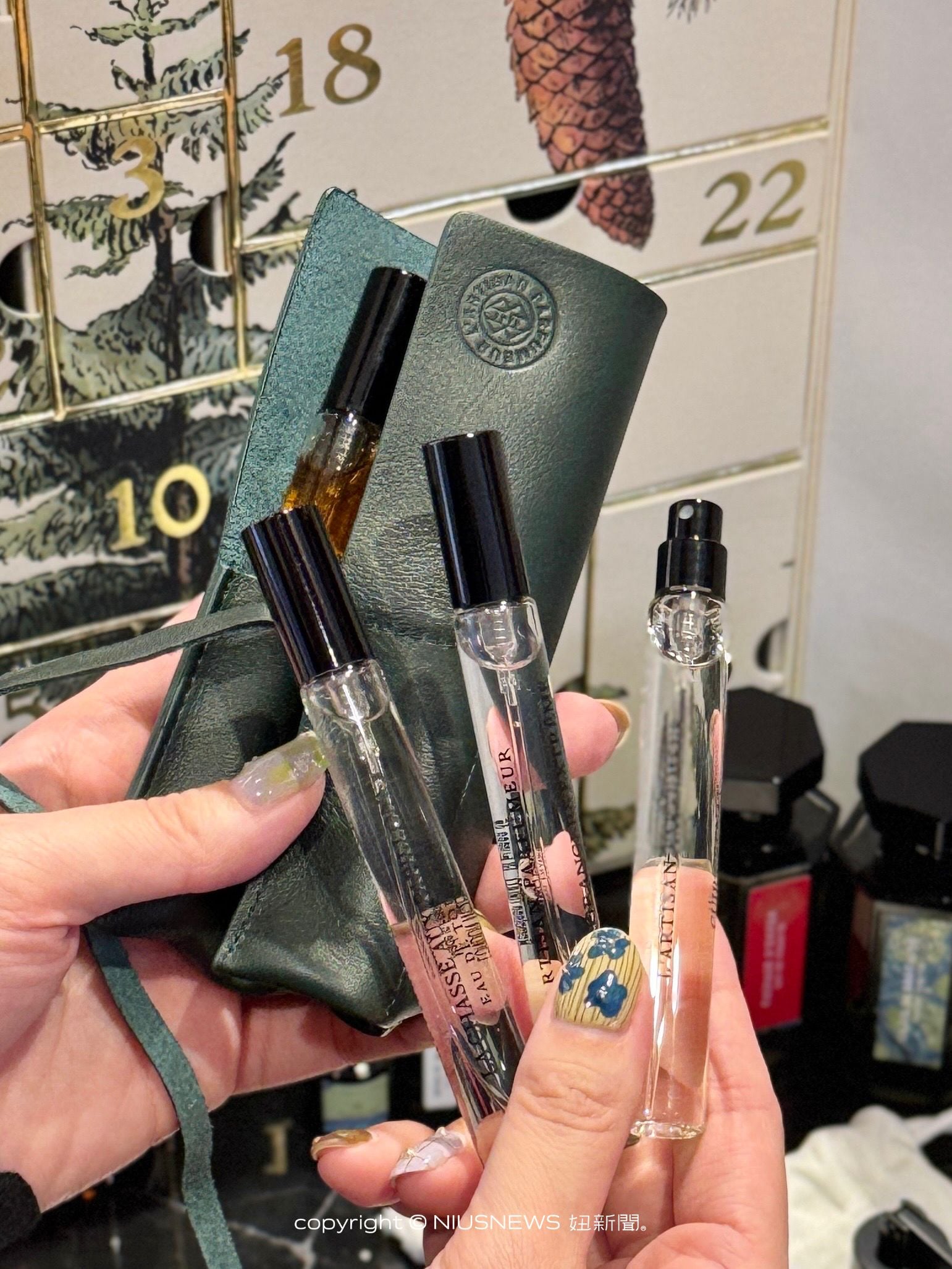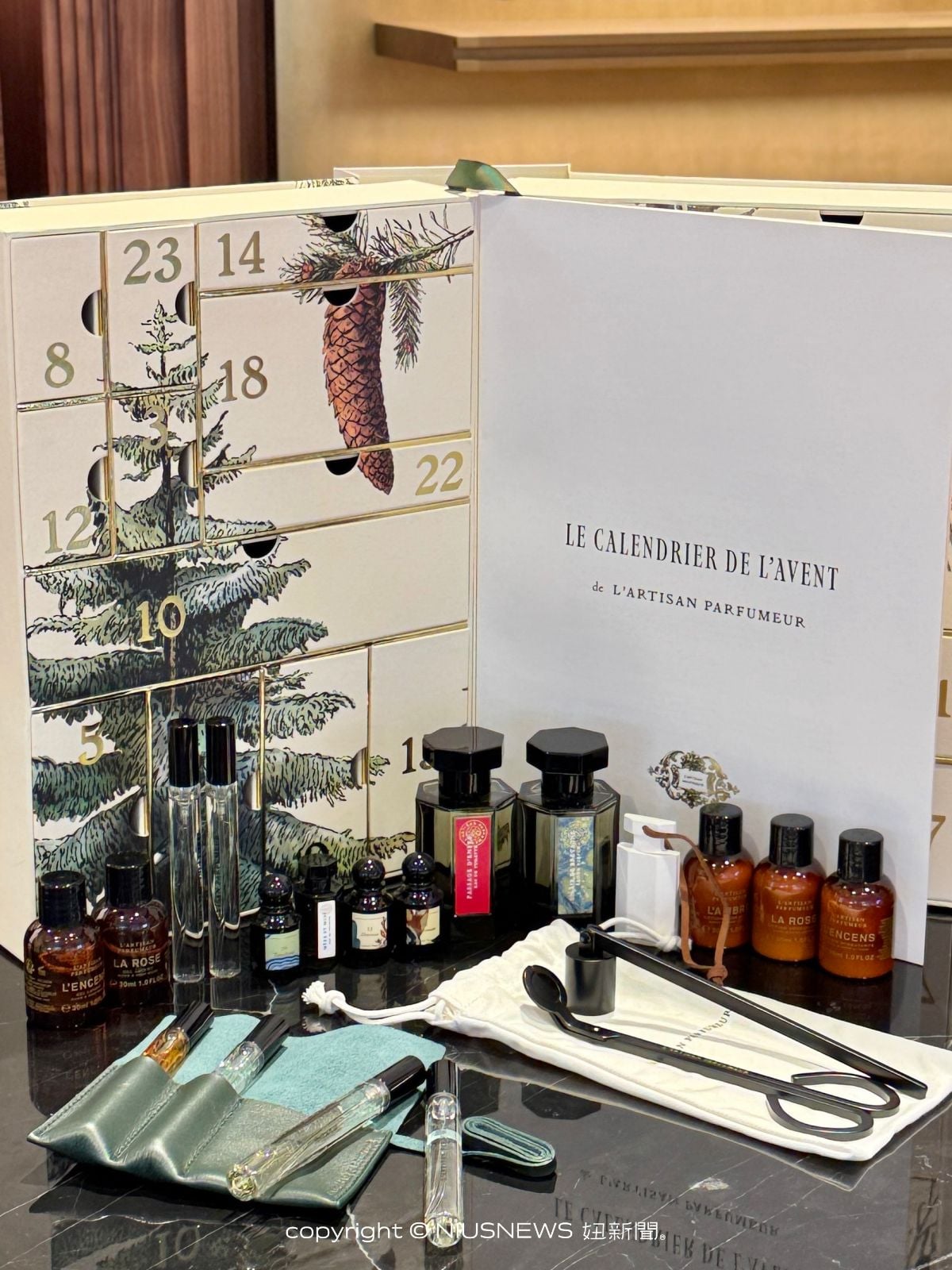 今年的聖誕倒數月曆收入24格驚喜,包含淡香水、淡香精、防煙滅燭罩、 燭芯修剪器、隨行香氛皮革套等品項,從12月1日到12月24日平安夜,每天都可以打開一格感受過節的氛圍。最大亮點收入了2款正裝香水,包含冥府之路淡香水50ml、布列塔尼的空氣淡香精50ml,都是目前具有高人氣的香味,還有提升居家香氛儀式感的防煙滅燭罩及燭芯修剪器,以及隨行香氛皮革套(顏色隨機),也是正裝產品。