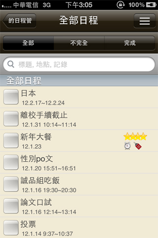 點選下方的選單「日程」則是進入了Schedule的功能中,可以以類別選擇要觀看的事件或是以不同的時間來選擇…