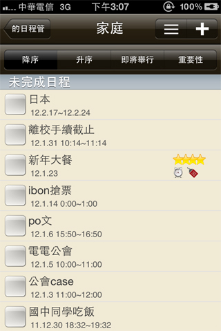 若選擇家庭的私人日曆,可自由的將事件降序或升序,亦可以即將舉行或重要性來做排列。