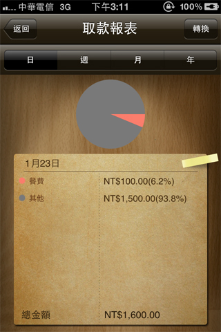並可以以圖表的方式具體的觀看報表,右上角的「轉換」則是可以切換收入與支出的圖表,淺顯易懂的方式可以讓你清楚的了解自身的金錢流向。
