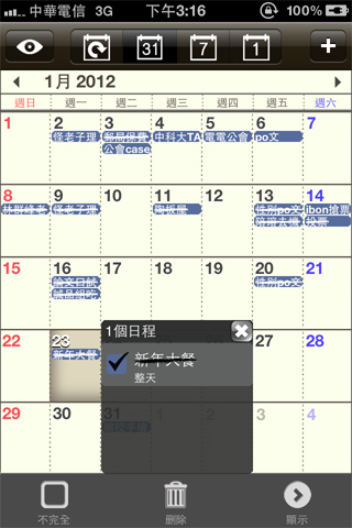 點選欲選取的事件後,下方會轉換成三個按鈕,看是要打勾將事件劃掉,或是刪除都可以,或是點選「顯示」進一步修改事件內容。