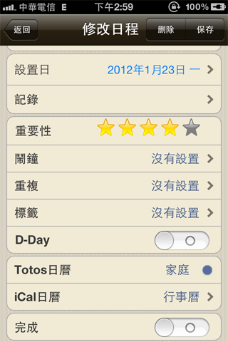 右上的即可加新事件,可以調整的內容一件也少不了,還可以針對個別事件的重要性作定義,時間、鬧鐘隨你調整。