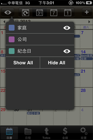 左上角的眼睛是一個篩選裝置,可以篩掉不想要顯示的項目,點一下右側的眼睛則可以關閉顯示,不想看到公事時就把公事關掉,讓眼睛清靜一下…