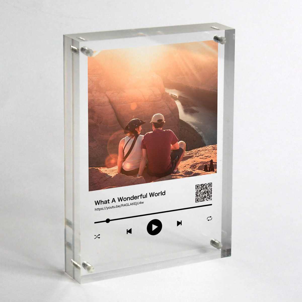 如果只是單純的放照片是不是有點平淡?那就試試看客製化專輯封面照片吧!挑選一首你們的專屬愛歌,或是親自錄一段,再以兩人的合照作為專輯播放封面,掃出相片上的QR code就邊聽歌邊欣賞兩人的美好回憶喔!