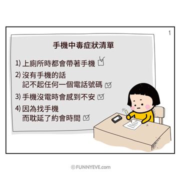 作者還特地畫出了有關於手機中毒的症狀,,讓人覺得超有共鳴,不知道妞妞們中了幾項呢?