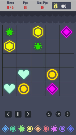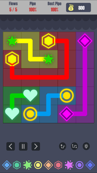 把這些可愛的符號兩兩配對連線,但路徑不可以和其他配對路徑重疊或交錯。玩到最後面困難度提高時,真的讓人好勝心燃燒啊!想不出解法時可以選擇消耗金幣點選提示,而路徑覆蓋了全部方格就是最高等解法,可以高分通過!