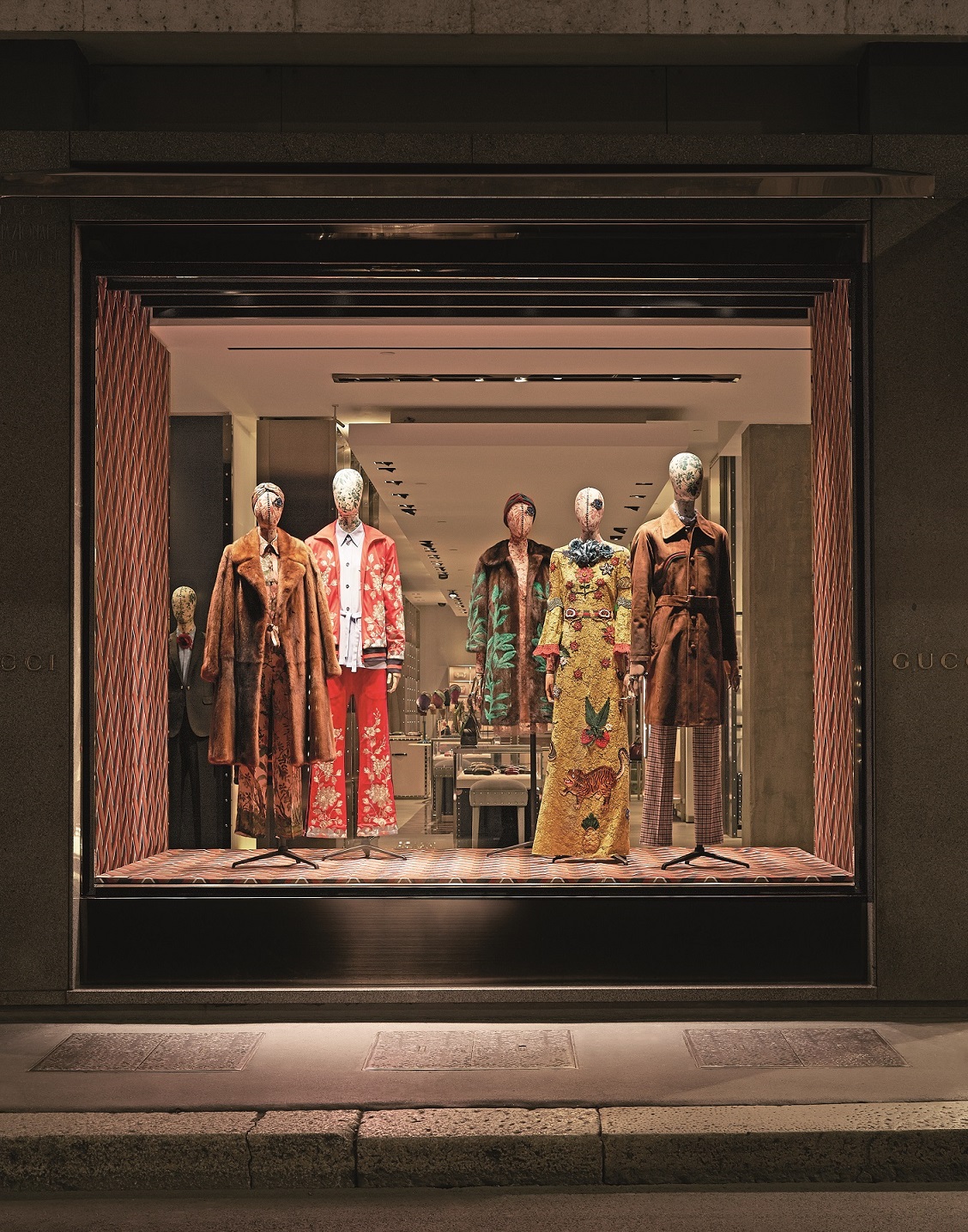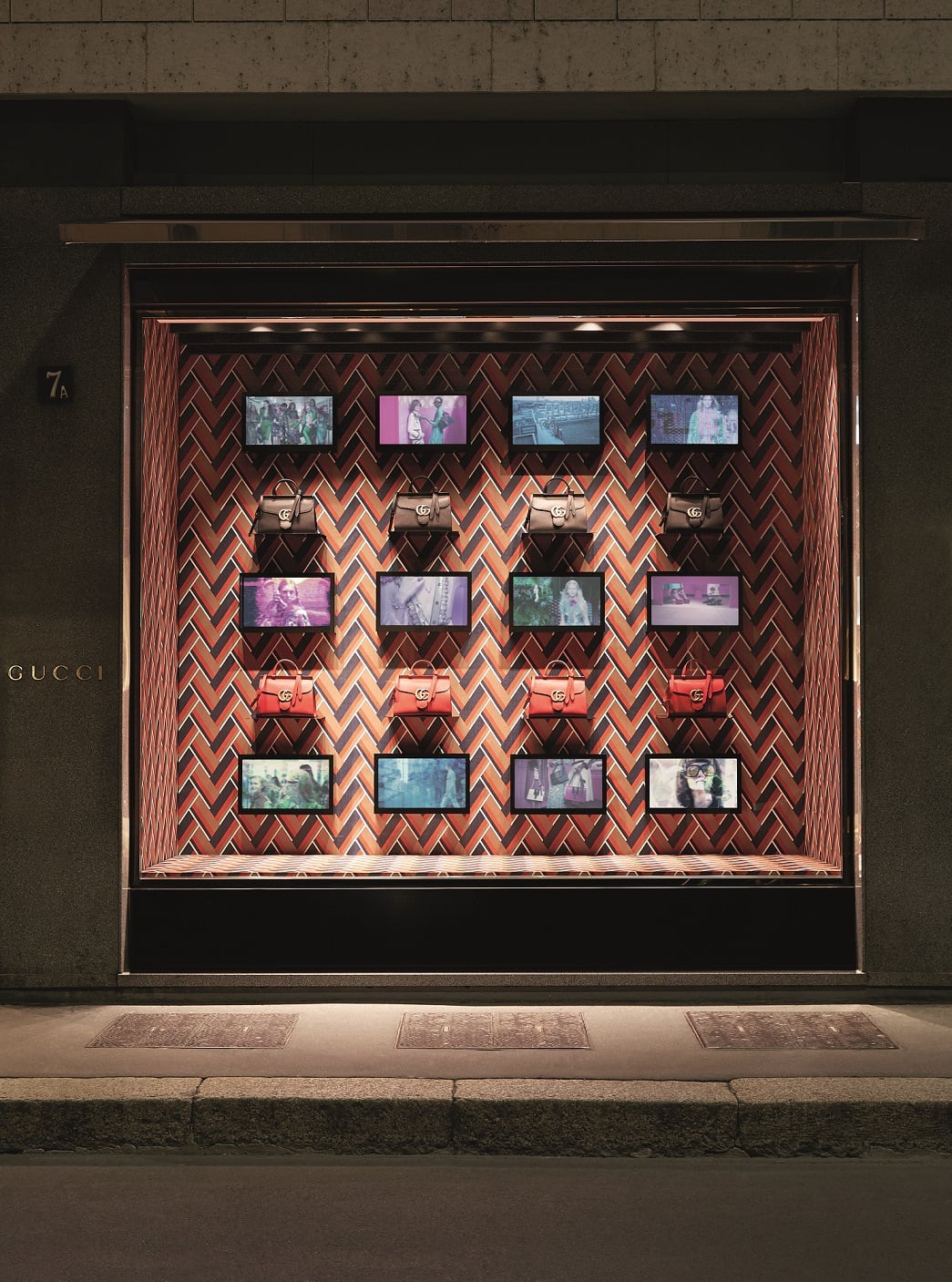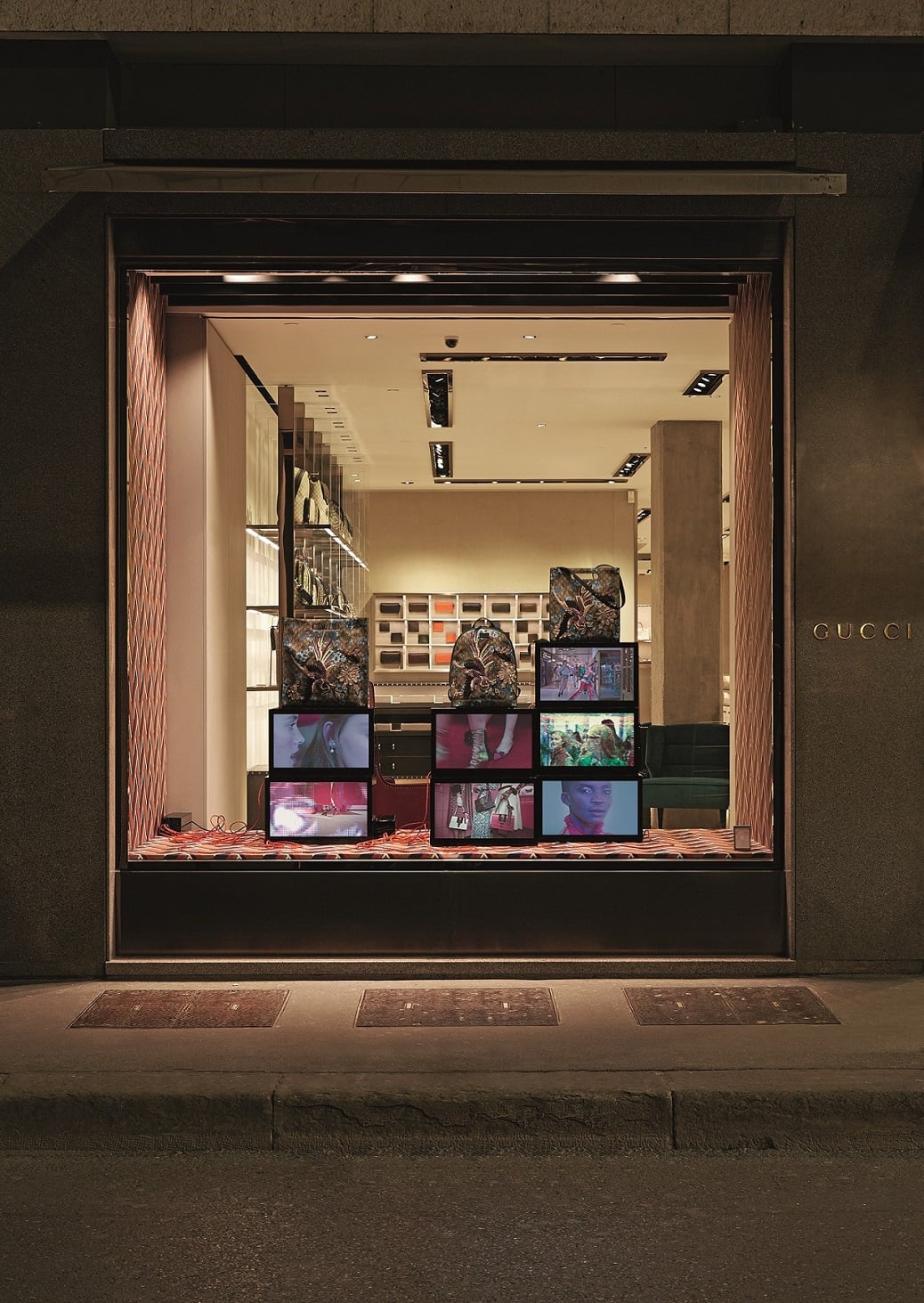 Gucci 2016春夏櫥窗新裝,以Alessandro Michele的人字紋設計為主要視覺,同時展現男士與女士系列,以及藝術影像裝置。人字紋圖騰覆蓋了櫥窗的三面立體,呈現大膽亮麗的視覺效果,多個顯示器懸掛在背牆上、或在地上堆疊,同步播放著為此次櫥窗特別創作的影像,人字紋靜謐卻不容忽視的存在,對比無聲、抽象的流動影像,Gucci又一次地透過櫥窗表達宣言,細細縫製的模特兒以紅與綠的植物花卉圖騰姿態,穿著春夏新裝矗立著。