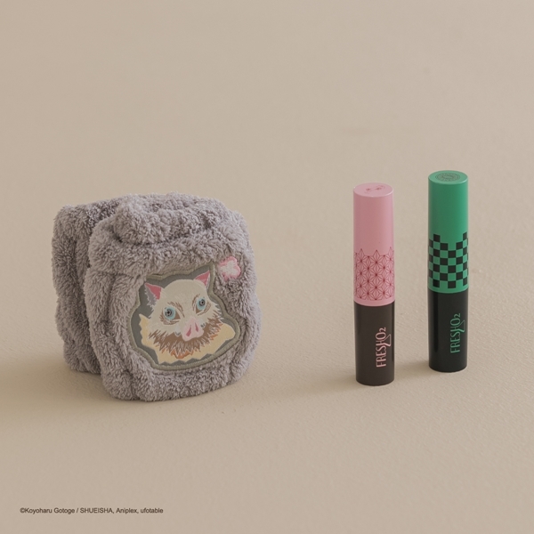 組合內含竈門炭治郎款無色的經典潤澤成分與竈門禰豆子款pH感應潤色款,成分添加修護Vitamin E、滋潤印加果籽油、保濕薔薇籽油等植物萃取,更特別搭配超可愛伊之助の居家髮帶,整組都非常實用。