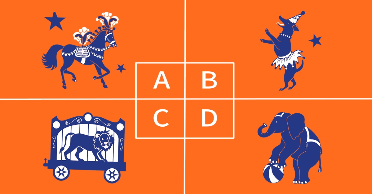 上面這張圖分別為馬戲團的四種動物:馬、小狗、獅子及大象,今天你從信箱中的傳單得知將會有馬戲團來到你的城市巡迴演出,試問你在傳單上看到哪種動物呢?請直觀地從A到D選擇一個。