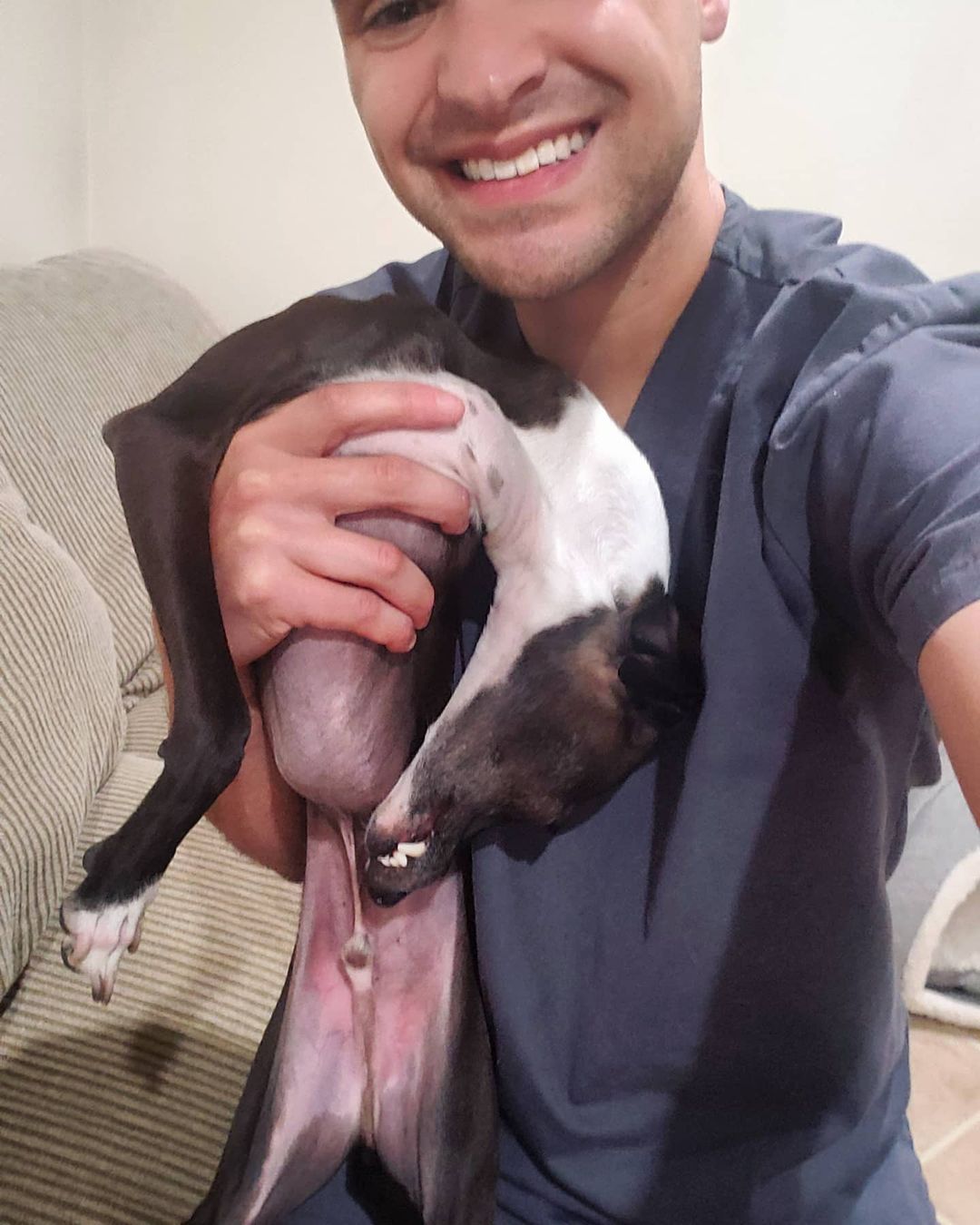 飼主西蒙斯其實是一名獸醫助理,Sparky的前腳其實之前受了很嚴重的傷,為了將牠醫治而施做了兩次手術,但考量到傷口仍不斷地折磨Sparky,經多方評估後決定截肢。Sparky的前飼主擔心自己的專業知識不足,無法好好照顧牠,於是就由西蒙斯帶回照顧,而現在牠也過得相當幸福。