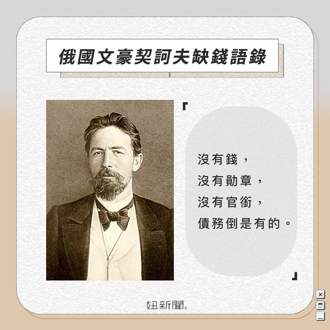 契訶夫缺錢語錄5.「沒有錢,沒有勛章,沒有官銜,債務倒是有的。」