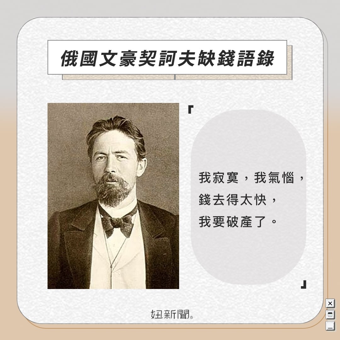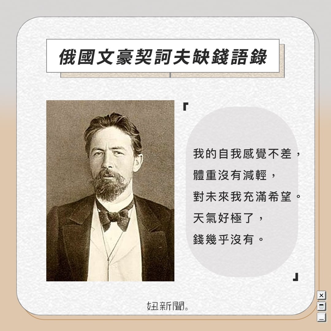 契訶夫缺錢語錄7.「願你快樂,別愁悶,別自作聰明,儘量少花一點錢。」