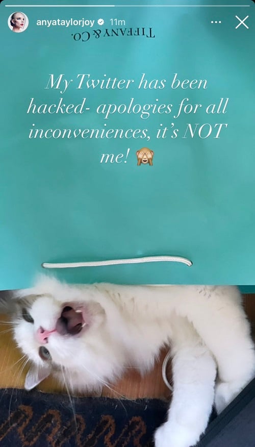 不過,該則推文隨即遭到刪除,帳號也緊急關閉,原因是這則貼文並非安雅泰勒喬伊所發,她隨後在 Instagram 限時動態澄清,表明她的推特遭到駭客入侵,對造成的不便感到抱歉,強調那則貼文並非由她所發布的,也讓期望再看到天才棋手的粉絲們感到些許失望。