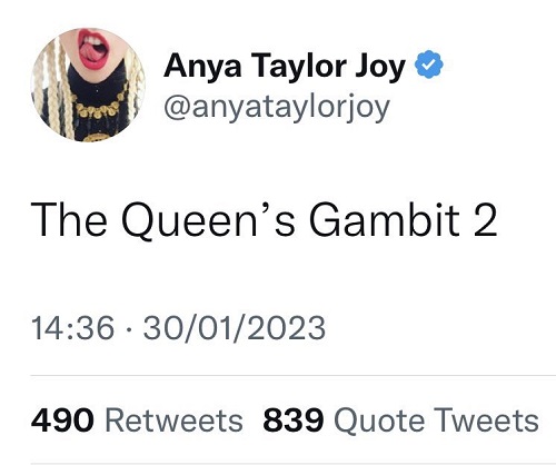 安雅泰勒喬伊在美國時間 30 日於推特發布一則貼文,上頭僅簡單寫著《后翼棄兵2》,讓不少網友認為是宣布劇集將拍第二季的消息。