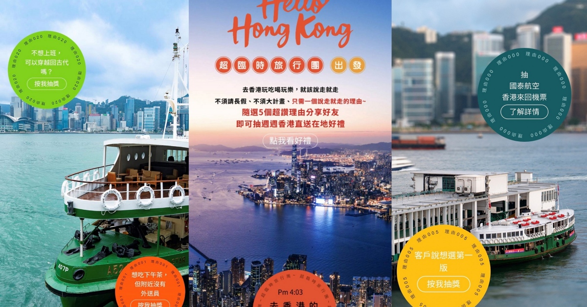香港旅遊發展局推出「去香港的N個理由」活動網站,以美食、景點、文化體驗及郊野等各方面的港味體驗,分享台灣旅客最道地的香港玩法,讓每個香港街角、港式美味都能成為消費者訪港的一大理由。即日起至7月31日只要於「Hello Hong Kong超臨時旅行團」活動網頁點選任一理由觀看景點內容,集滿五個理由並以Line分享給好友,即可抽港味十足的金牌燒鵝掛飾環保袋或香港叮叮車模型,讓消費者搶先感受香港魅力。
