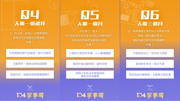 準備入職前,你剛好在0830抵達公司樓下,你會「發訊息告知、只差等電梯時間、上樓後表示歉意」;第一天上班,午休時間大家都在位置上吃便當,你會「問同事要不要一起吃、到便利商店買午餐、探索附近好吃的餐廳」;菜鳥第三天的你,發現大家都在使用一些你不太懂的英文單詞,你會「點頭假裝聽懂、事後找機會問同事、當下直接詢問」?