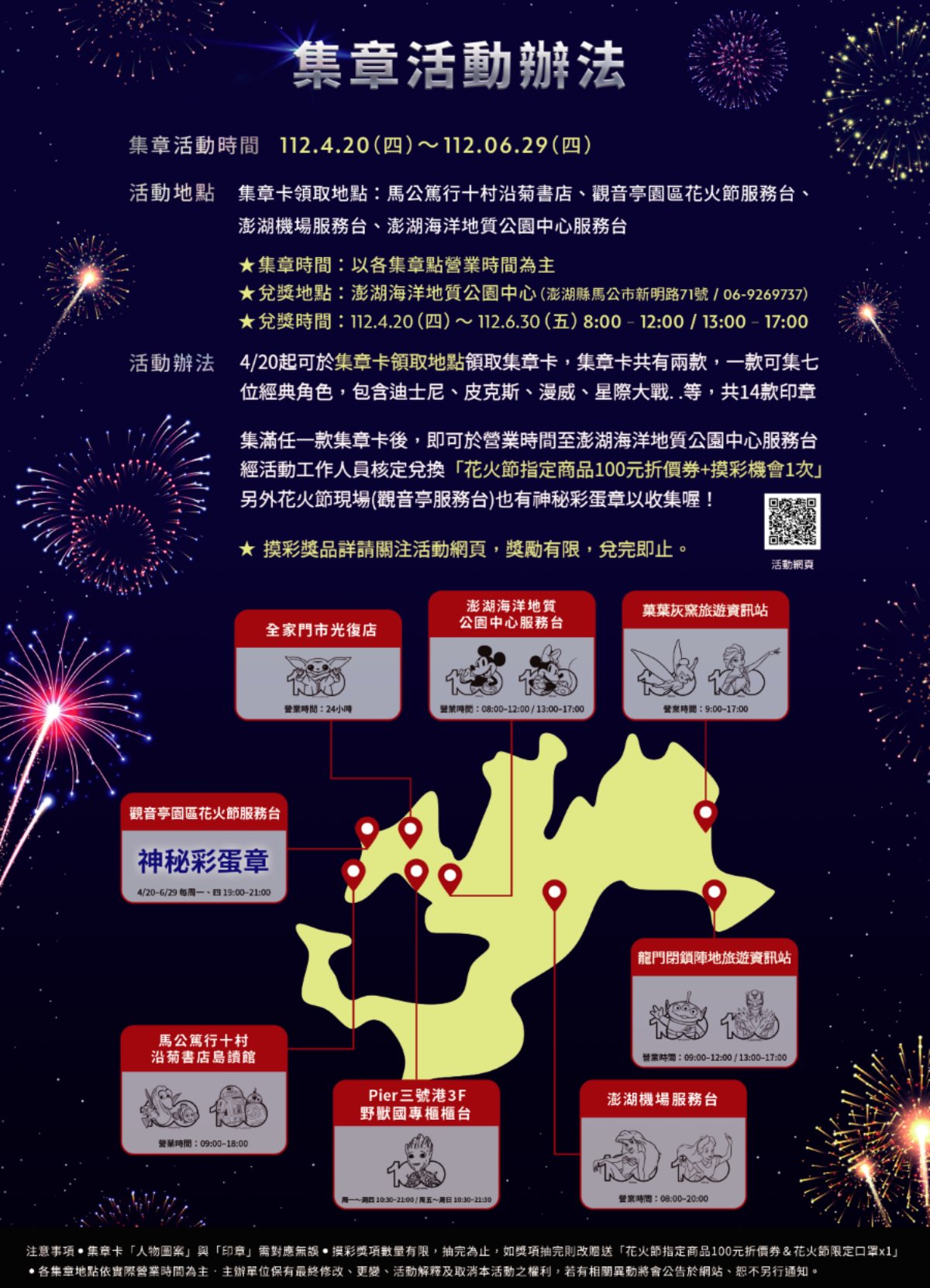 集滿任一款集章卡後,即可於營業時間至澎湖海洋地質公園中心服務台,經活動工作人員核定兌換100元花火現場商品折價券,以及摸彩機會1次,有機會抽中和田大飯店的住宿券、7-ELEVEN商品券、南海傳票等好禮,另外花火節現場也有神秘彩蛋章可以收集喔!
