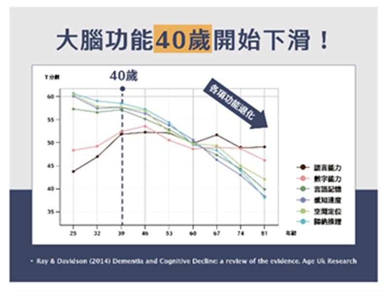 有研究指出大腦認知功能在40-50歲就開始有退化的現象[8],醫師建議及早開始預防與保養非常重要,保持均衡飲食,補充足夠的維生素與礦物質。
