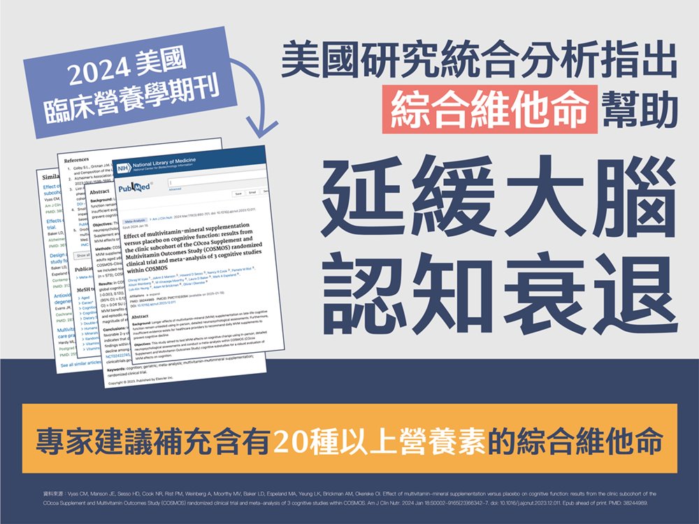 美國刊載在臨床營養學期刊上的統合分析顯示[9],綜合維他命對大腦的整體認知和記憶都有好處,醫師說明:「在這個研究中,每天有吃綜合維他命的人,相較於安慰劑組,大腦認知功能可說是年輕了接近2歲。所以如果飲食無法確保均衡的人,會建議他們可以每天吃一顆綜合維他命去補足大腦跟身體所需的營養。」。