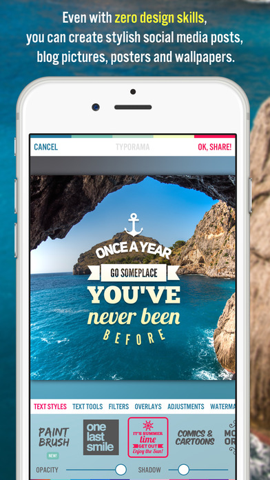 才說到旅行一定要搭配照片,除了要有好的濾鏡之外,你也可以使用《Typorama》在照片加上文字說明,有創意的文字排版和靚麗的風景,不只能幫你把回憶加分,甚至可以印下來當作裝飾海報喔!