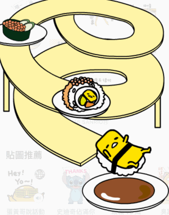 手機小姐一樣幫大家精選了三張出來,像是這張不只要讓壽司上迴轉盤,還讓它們玩起了溜滑梯!你看看蛋黃哥扮成的玉子燒壽司掉下去的樣子是不是很生動?