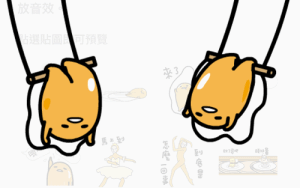 上排左一的動圖雖然看起來像是「破蛋而出、奮發向上的樣子,但是蛋黃哥是這種勵志的卡通角色嗎?肯定不是的啊~所以音效的部份是非常詭譎的「嚓,燈楞楞楞~」(愁雲慘霧的概念?)